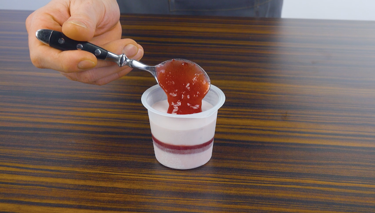 1.1 Nimm je Portion 3/4 des Joghurts aus dem Becher und stelle diesen Teil erst einmal beiseite. Fülle dann 2 EL Erdbeerkompott in den Becher. Gib nun 3 EL des beiseitegestellten Joghurts auf das Kompott. Auf diese Joghurtschicht kommt abschließend noch eine weitere Schicht Kompott.