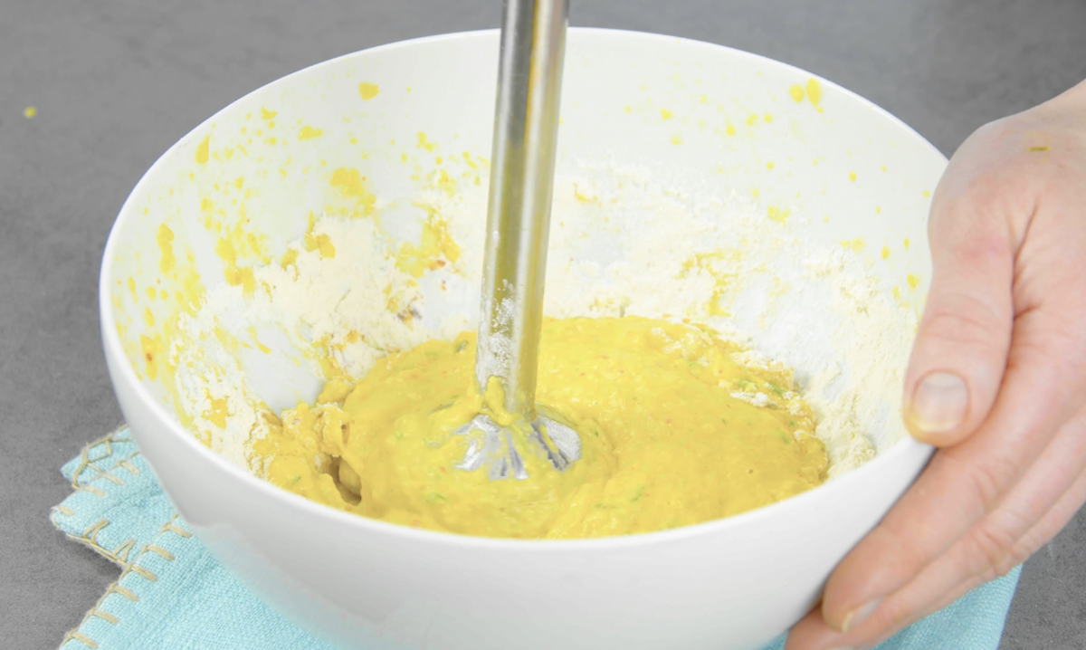 2.2 Vermische Mehl mit Salz, Natron und Backpulver. Gib dann die zuvor pürierten Zutaten hinzu und rühre alles glatt. Fülle den Teig in eine Muffinform und schiebe sie für 50 Minuten bei 160 °C Umluft in den Ofen.