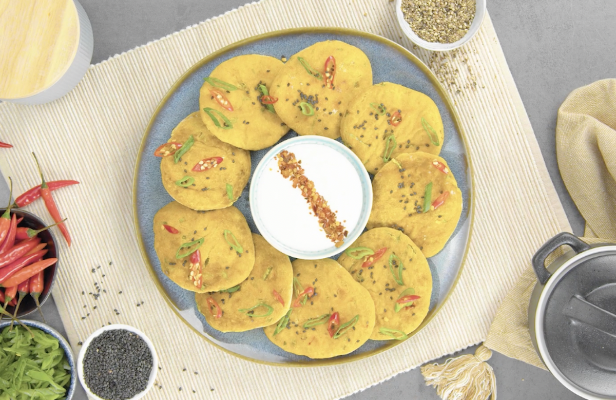 4.3 Serviere die Gemüse-Cookies mit Frühlingszwiebeln, frischem Chili und Joghurt-Dip.