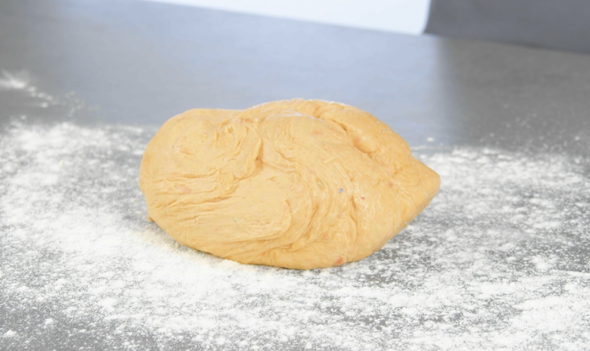 1.1 Püriere die Dosentomaten mit dem Tomatenmark und füge die Hefe hinzu. (Hinweis: Du kannst auch frische Tomaten verwenden; lass dann die Tomaten zuvor für 20 Min bei 180 °C im Ofen garen). Lass die Tomaten-Hefe-Mischung für 15 Minuten stehen, füge dann Mehl, Fenchelsamen und Salz hinzu und vermische alles zu einem Teig. Knete den Teig für ca. 10 Minuten mit der Hand oder 6 Minuten mit der Maschine, gib ihn in eine Glasschüssel und decke diese mit Frischhaltefolie ab. Lasse den Teig an einem warmen Ort für 35-40 Minuten gehen; er sollte sich vom Volumen her ungefähr verdoppeln.