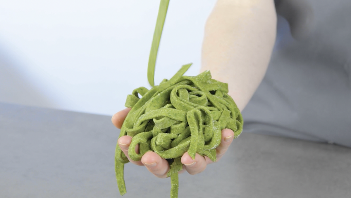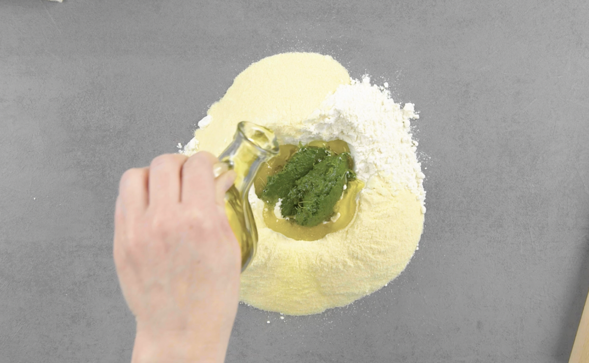 3.1 Gib Mehl, Salz und Grieß in eine Schüssel und verrühre alles. Schütte die Mischung auf deine Arbeitsplatte und forme in ihrer Mitte eine Mulde. Sautiere den Spinat, vermische ihn mit dem Wasser und püriere alles. Gib die Spinat-Mischung danach in die Mulde in den trockenen Zutaten auf deiner Arbeitsplatte und gieße noch das Olivenöl hinzu. Vermische nun den Teig mit deinen Händen und knete ihn ca. 5 Minuten. Lasse ihn abgedeckt ca. 1 Stunde ruhen.