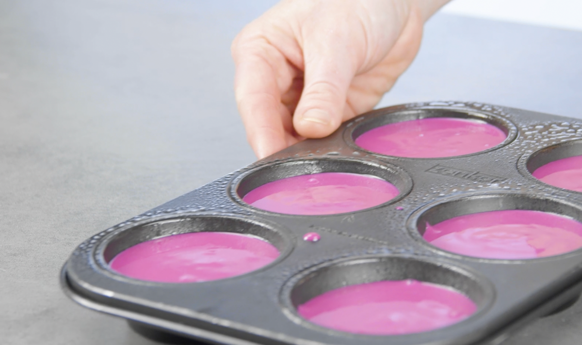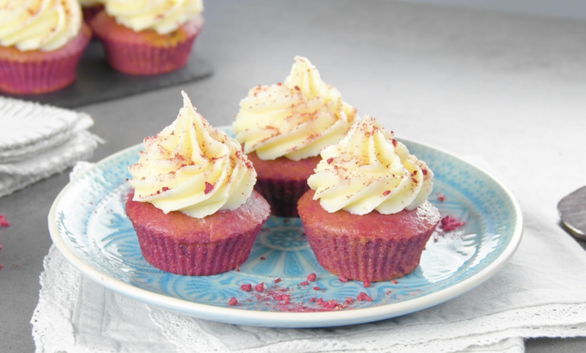 2.3 Lasse die Muffins dann abkühlen und dekoriere sie mit einem Buttercreme-Frosting und gefriergetrockneten Himbeeren.
