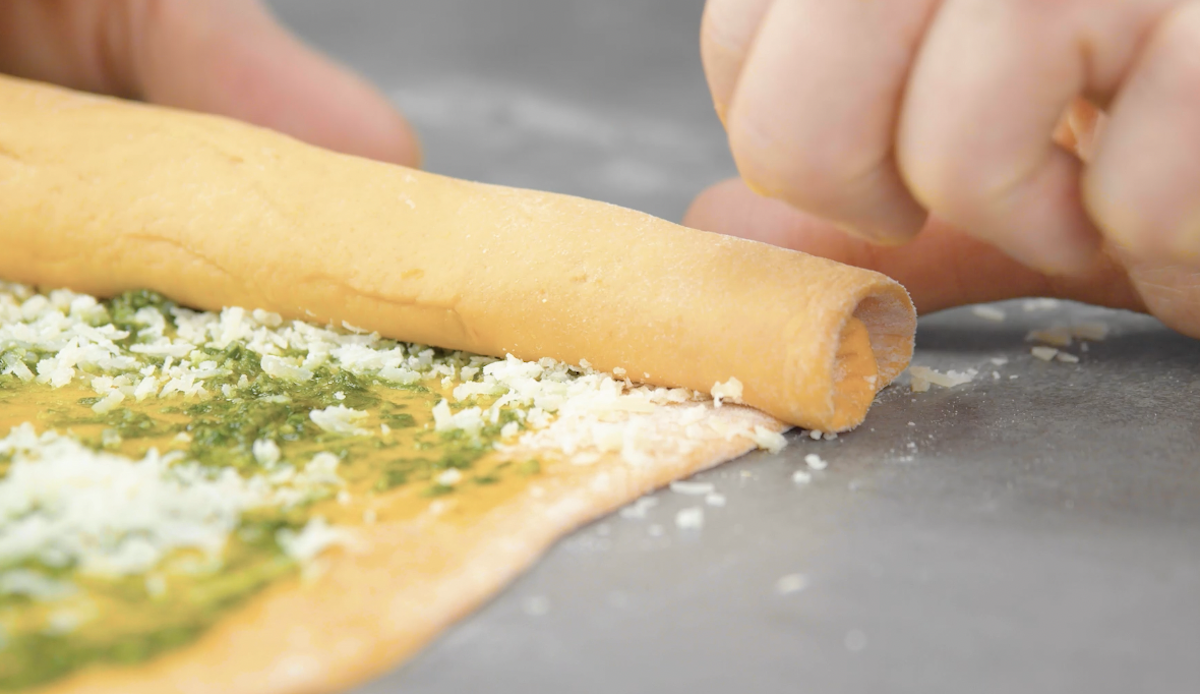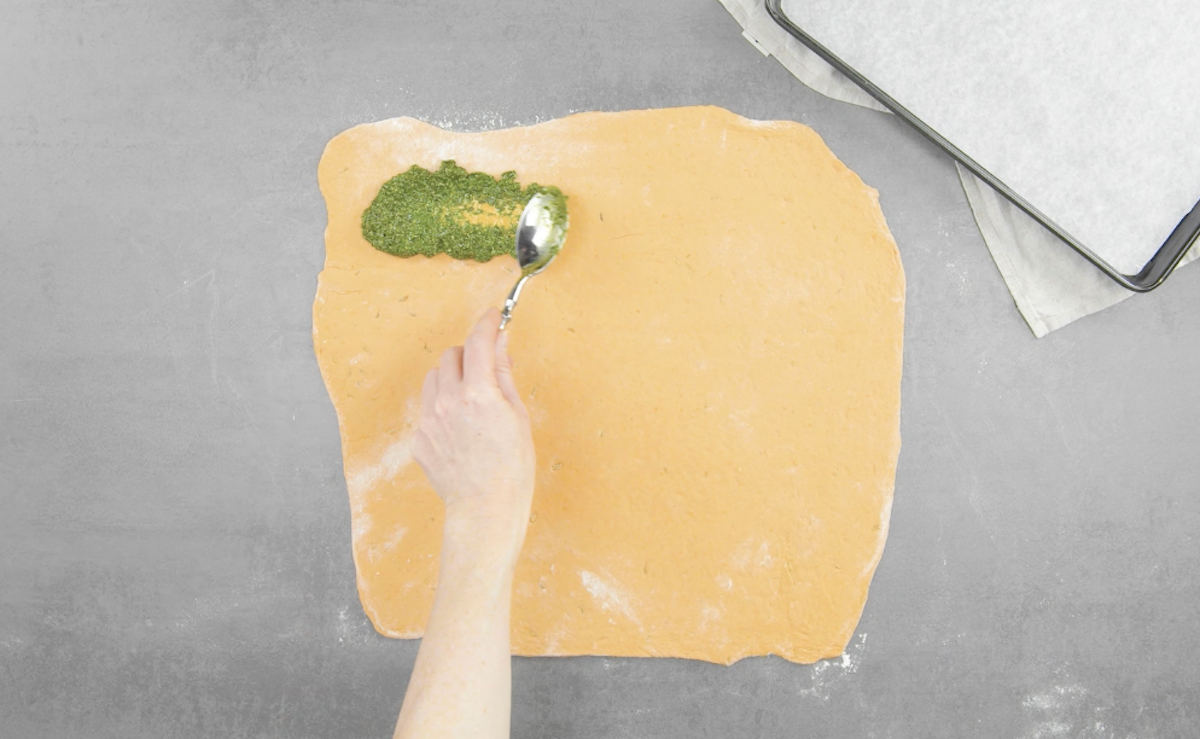 1.2 Rolle den Teig aus, bis ein dünnes Rechteck entstanden ist, bestreiche dieses mit Pesto und streue Parmesan darüber.
