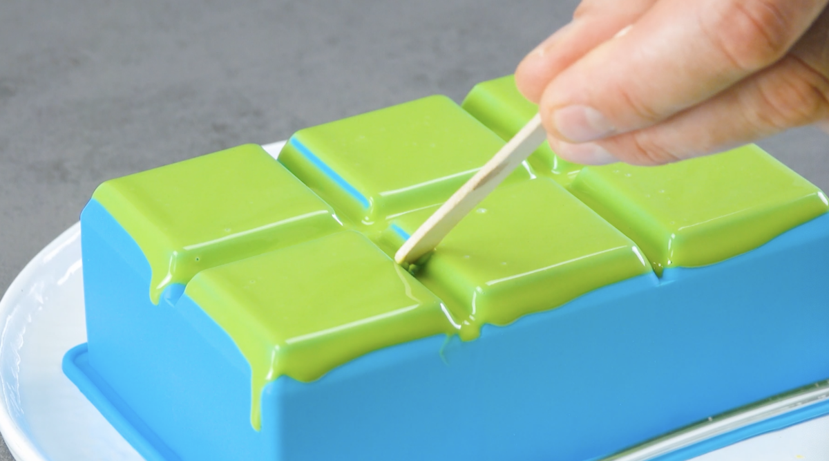 1.4 Lass die Schokolade im Kühlschrank aushärten und löse sie dann vorsichtig von der Form. Insgesamt werden von jeder Farbe neun Quadrate gebraucht, das ergibt insgesamt 54 Schokoplättchen. Wenn alle Schokoquadrate ausgehärtet sind, kannst du den Kuchen mit ihnen verzieren.