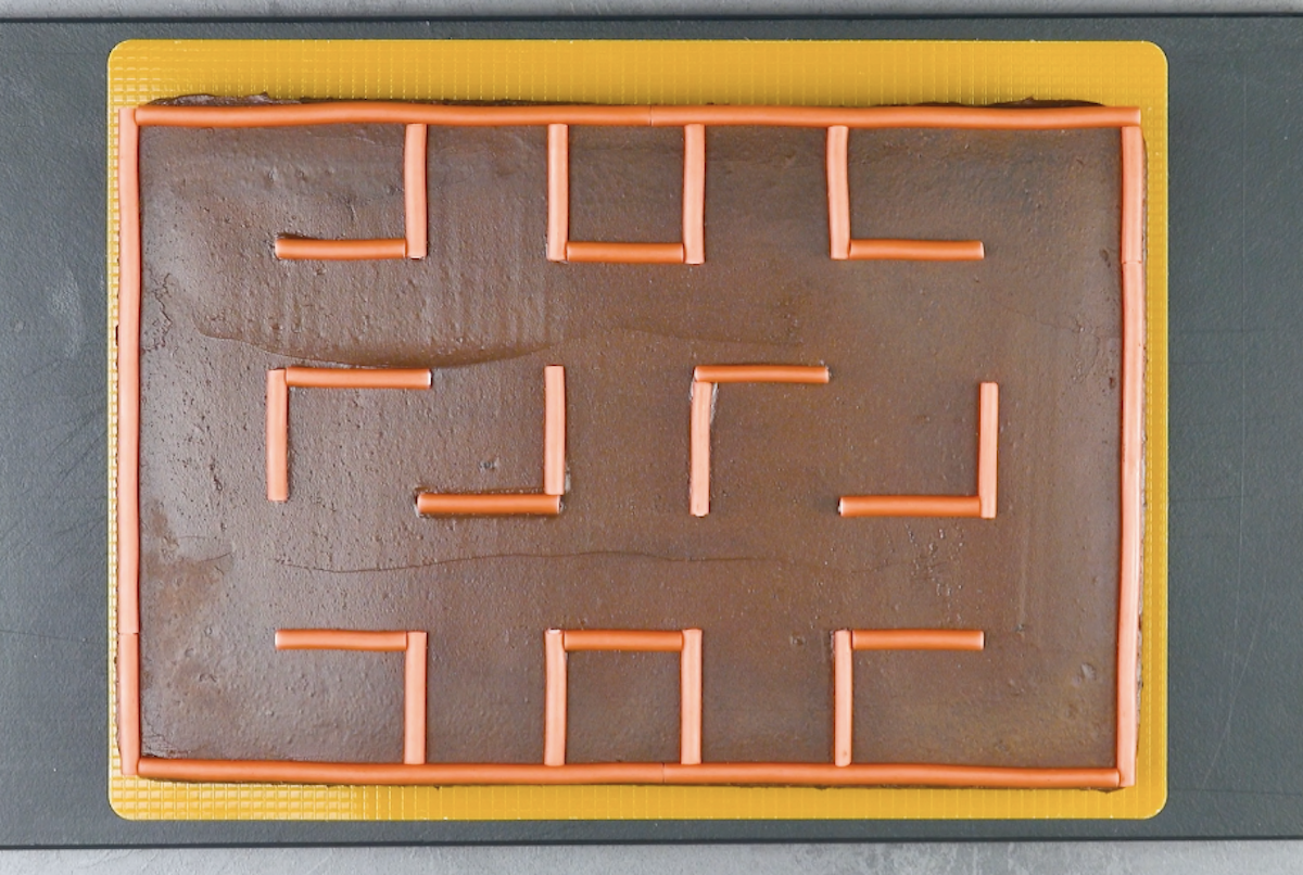 4.3 Belege die Ränder des Kuchens mit den Haribo-Streifen und platziere auf dem Kuchen mit dem Waffelgebäck die Tetrissteine.