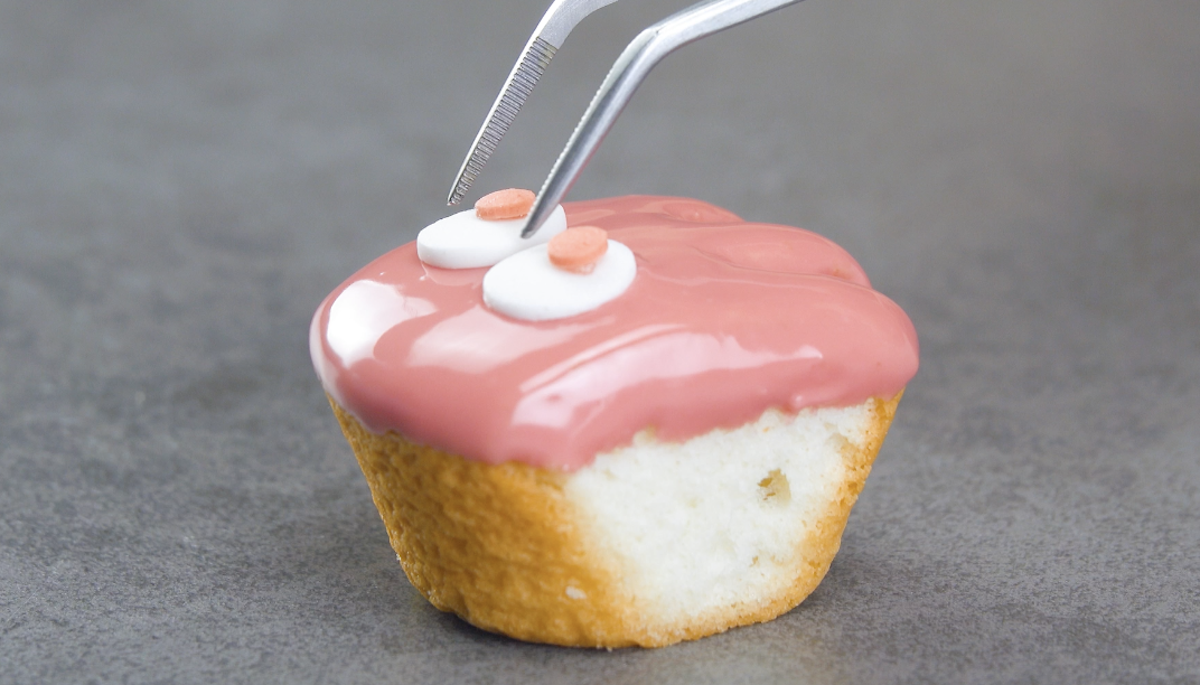 3.4 Schneide die Minimuffins in die Formen von Pac-Man und den Geistern und tunke sie in bunte, geschmolzene Schokolade. Verziere Geister und Pac-Man noch mit Zuckeraugen und Schokoperlen.