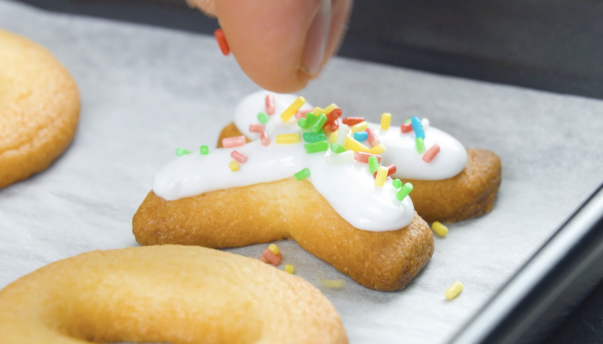 2.3 Dekoriere die gebackenen Kekse mit Zuckerguss und bunten Streuseln.
