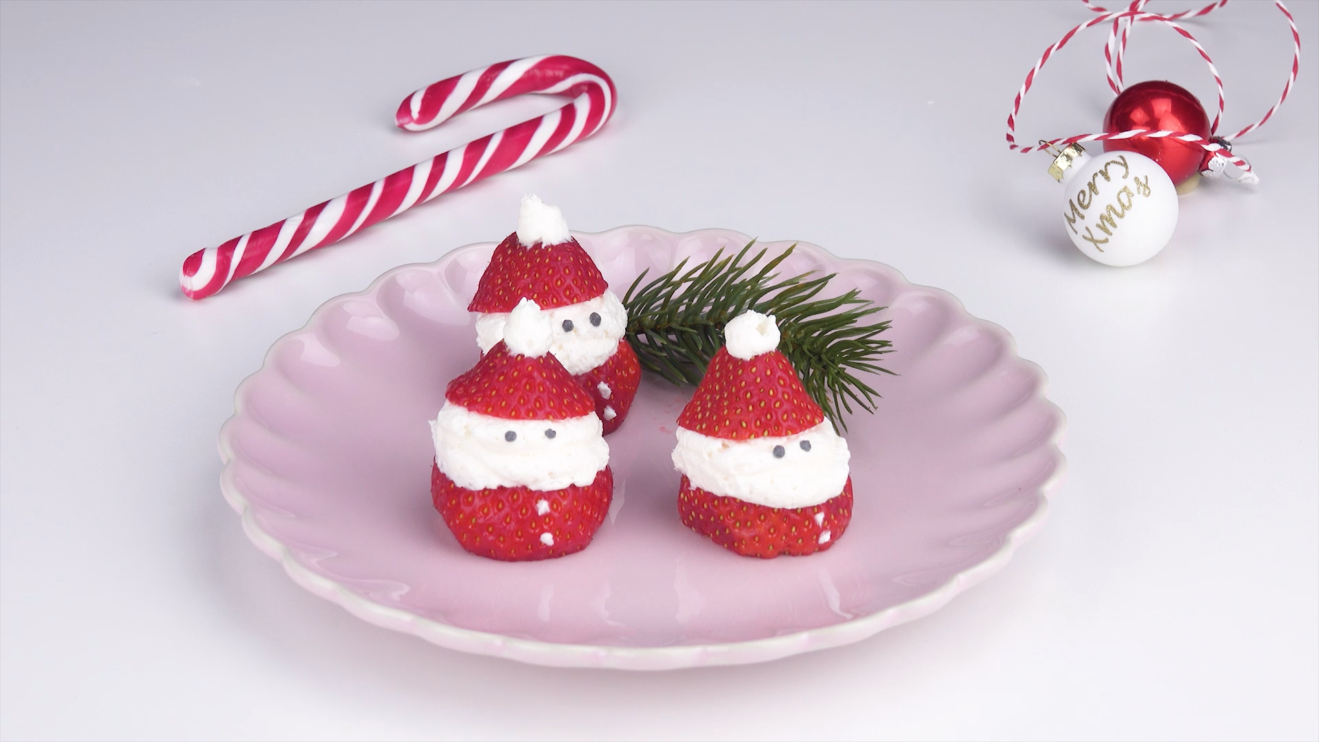 - Spritze die Sahne zwei bis drei Zentimeter hoch auf die Schnittfläche und setze die Fruchtspitze wieder auf. Spritze dann mit der schwarzen Sahne zwei Äuglein auf. Etwas Sahne auf der Erdbeerspitze bildet die Mützenbommel. Schließlich setzt du noch zwei kleine Sahneknöpfe auf den Bauch der Weihnachtsmänner.