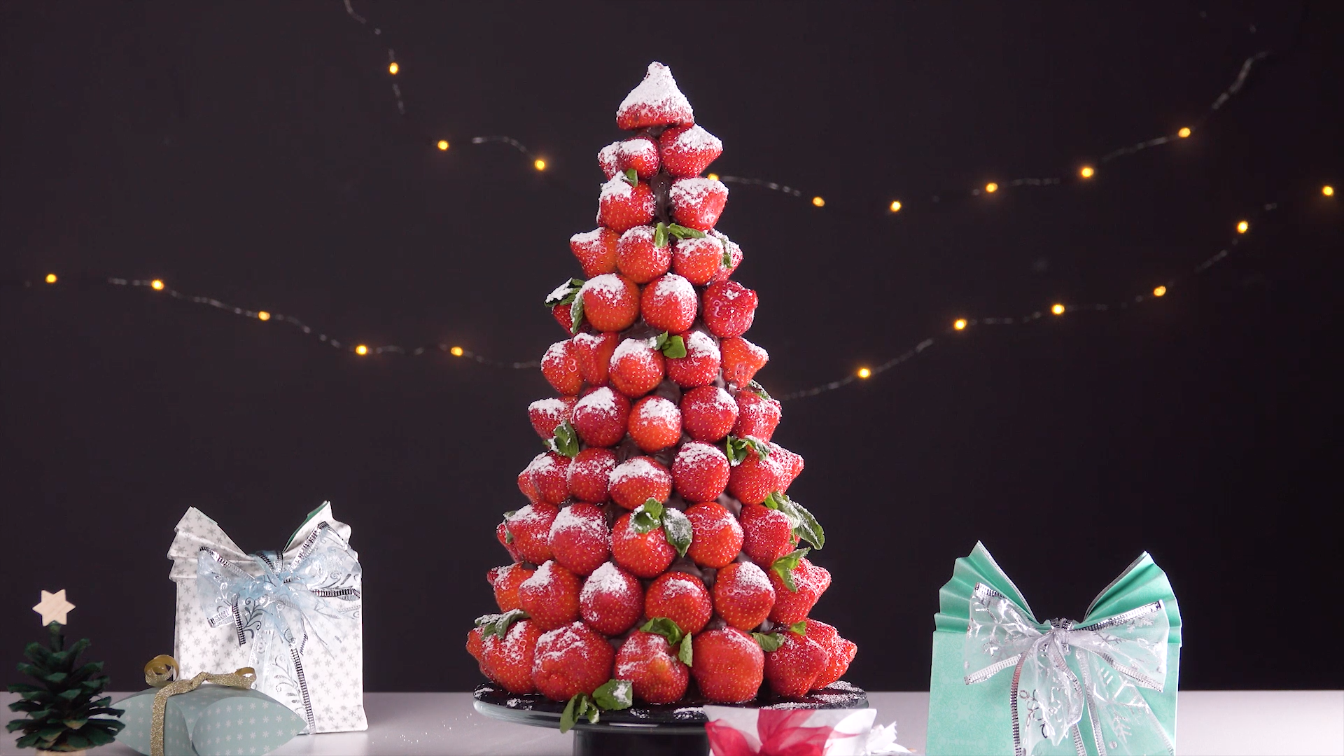 - Schneide das Grün von allen Erdbeeren und setze sie mit der Schnittseite in die noch feuchte Schokolade. Arbeite dich Reihe um Reihe nach oben. Du kannst die Erdbeeren auch etwas in Schokolade tauchen und dann an den Kegel setzen. Schließlich setzt du einige Minzblätter zwischen die Erdbeeren und bestäubst den fruchtigen Weihnachtsbaum mit Puderzucker.
