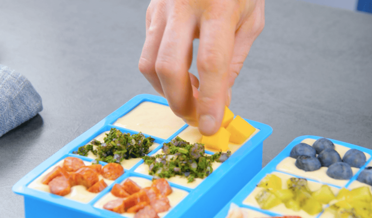2.1 Fülle den Teig in die Eiswürfelform und verteile die geschnittenen Zutaten in den jeweiligen Kammern (pro Zutaten immer zwei Kammern). Friere die Form für mindestens 6 Stunden ein.