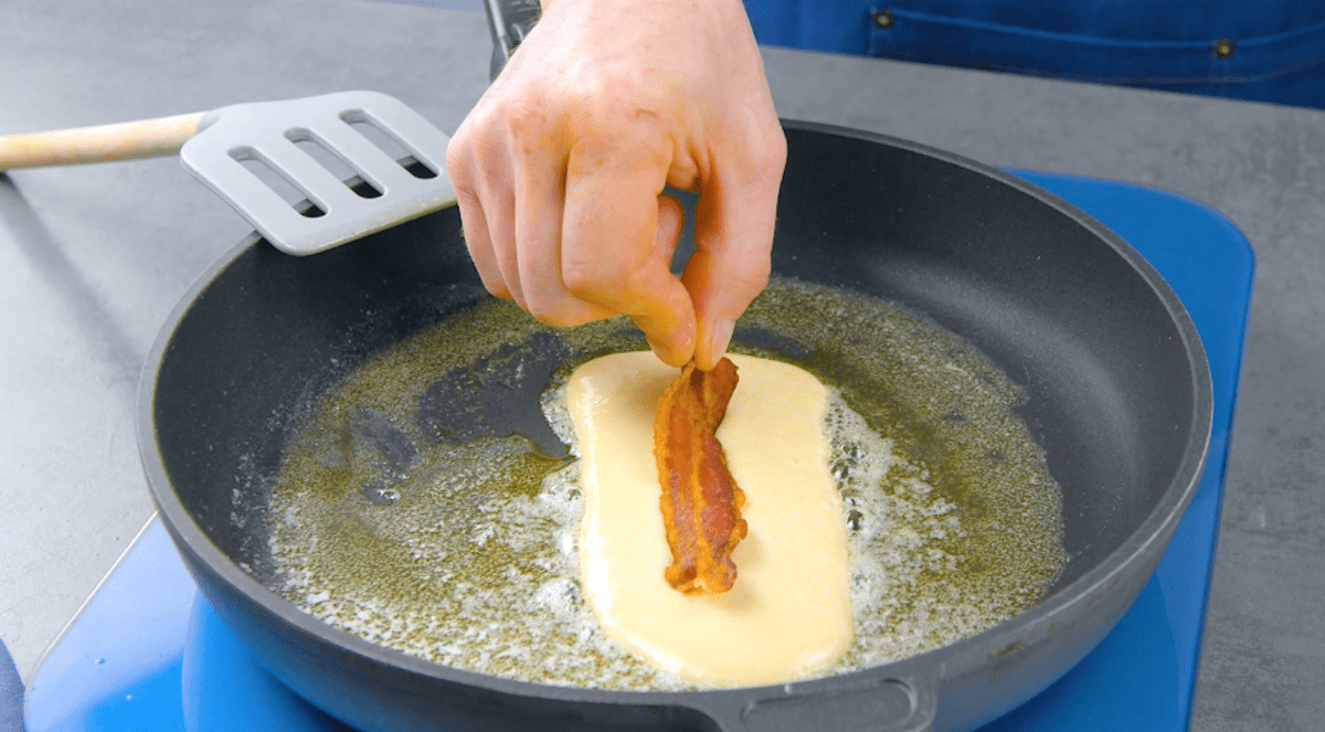 1.2 Gib Butter in eine Pfanne und außerdem 2 EL vom Teig. Brate den Pancake für ca. 5 Minuten an. Lege dann eine Scheibe krossen Bacon auf den Teig und bedecke diesen mit weiteren 2 EL Teig.