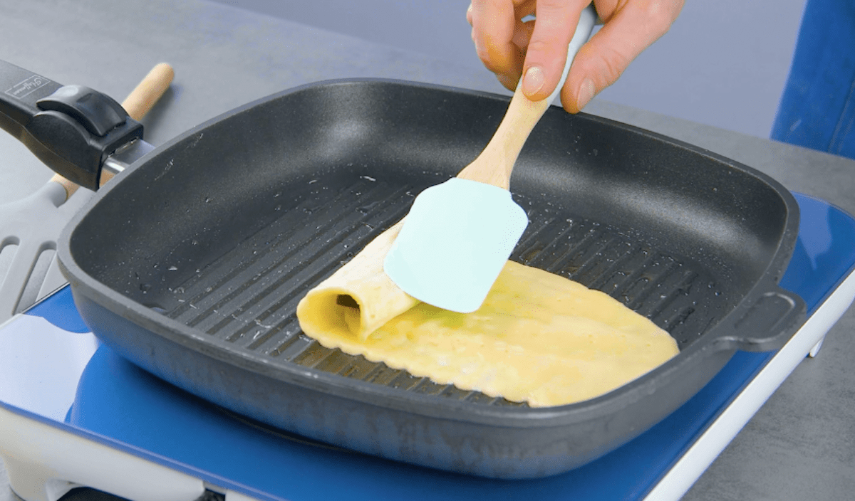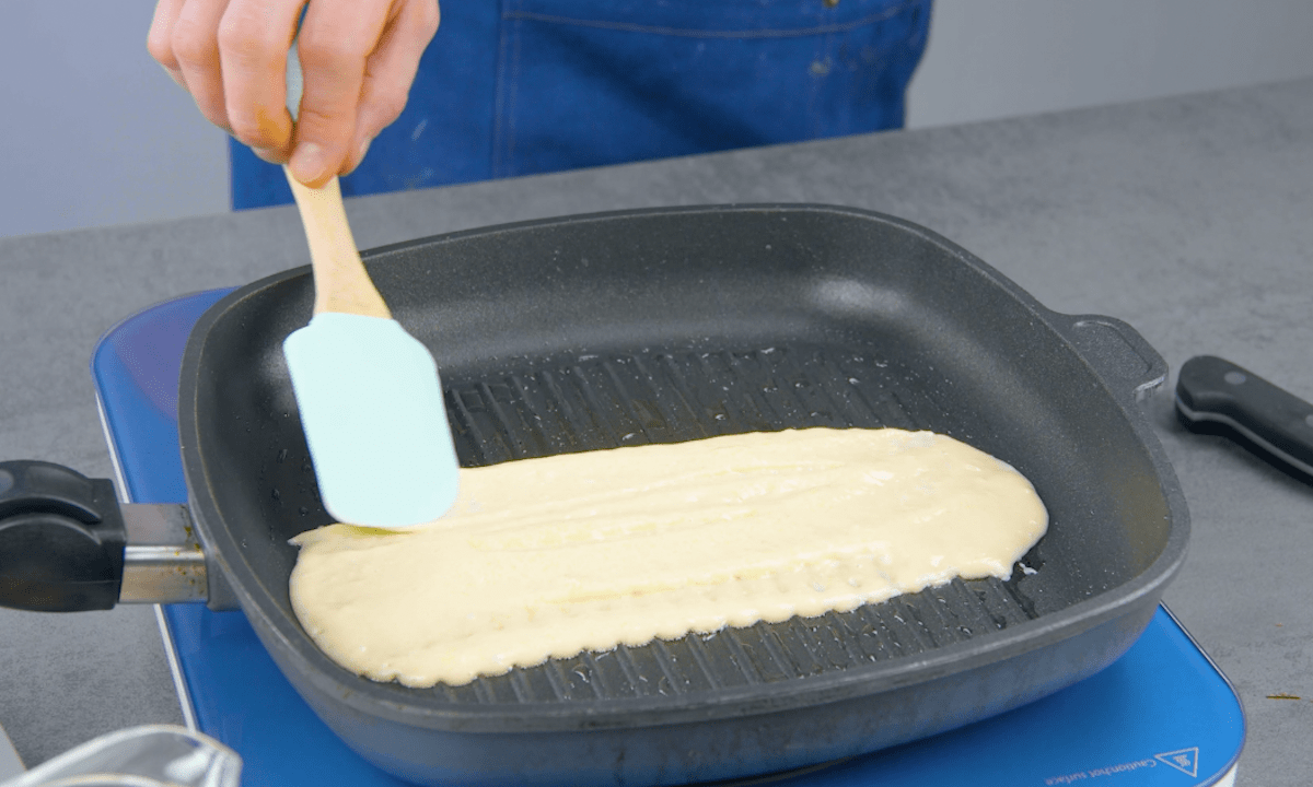 3.1 Gieße den Teig längs in die Pfanne und brate ihn für ca. 2 Minuten. Verstreiche ihn mit einem Teigschaber, damit der Pancake schön flach wird .