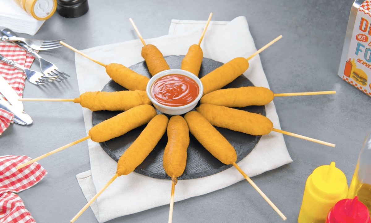 4.3 Serviere die Würstchen im Teigmantel zum Beispiel mit Ketchup.