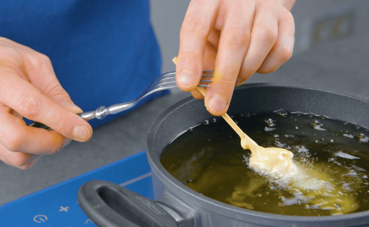 4.2 Frittiere nun die Spieße in heißem Öl (160 °C) für etwa 5 Minuten, bis sie goldbraun sind.