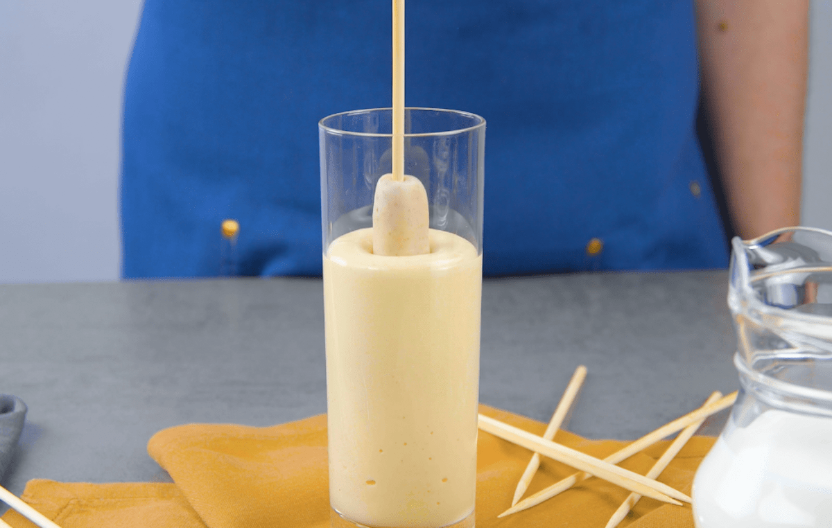 4.1 Fülle den Teig in ein hohes Gefäß. Spieße die Würstchen auf und tunke sie in den Teig, bis sie komplett ummantelt sind.
