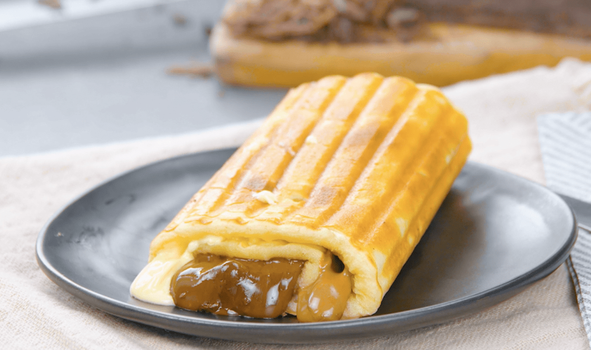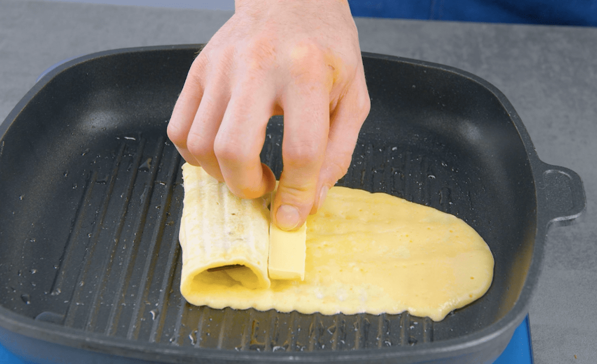 3.3 Nun kommt die weiße Schokolade auf den Pancake. Klappe ihn ein weiteres Mal um.