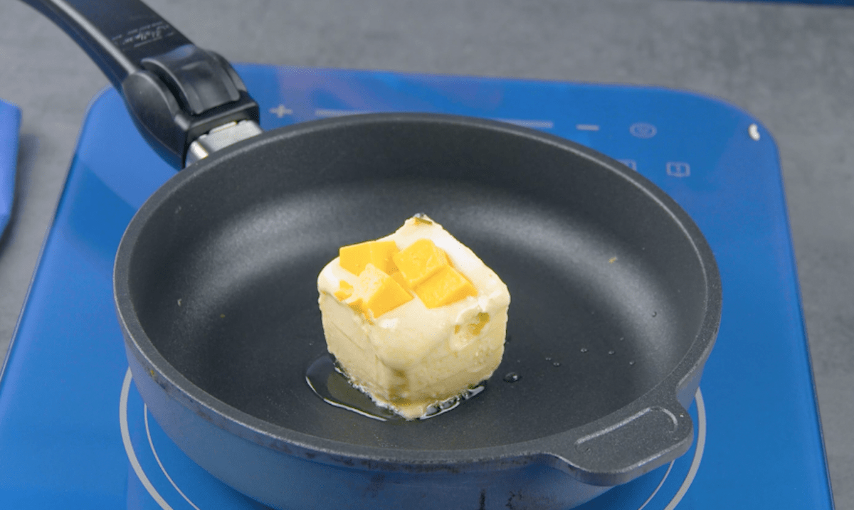 2.2 Löse die Würfel aus der Form und brate sie dann mit etwas Öl bei niedriger Temperatur für 10 Minuten in einer Pfanne an.