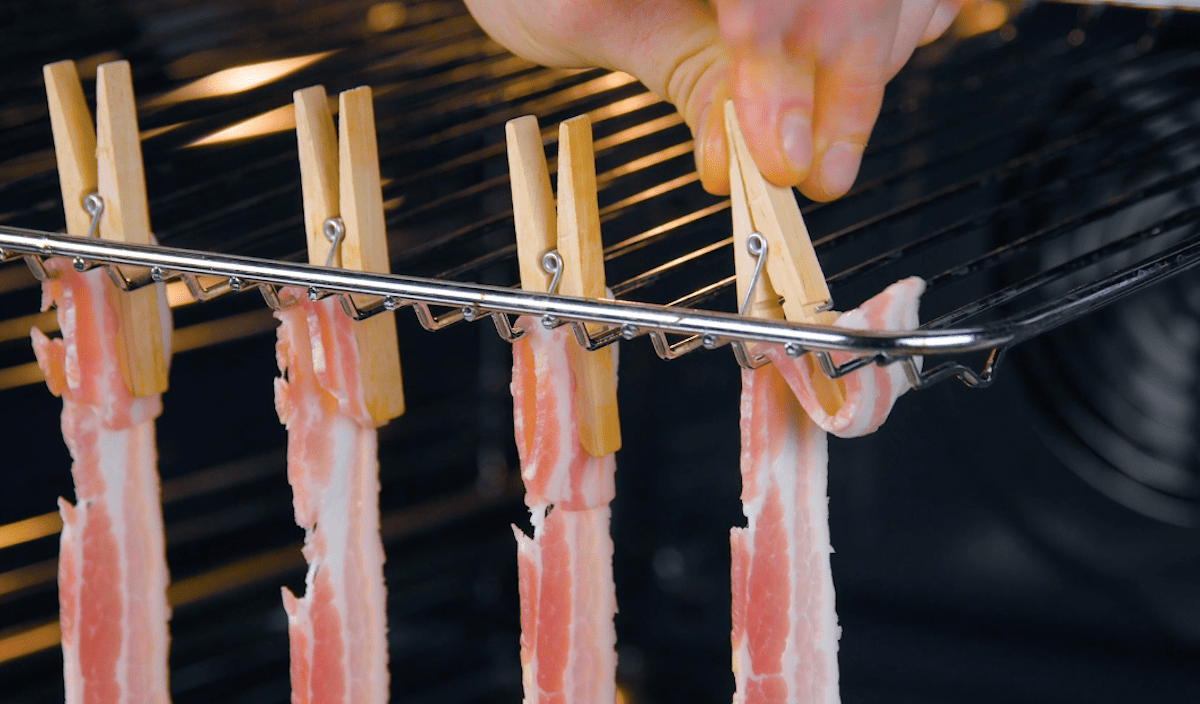 1.1 Hänge die Baconscheiben mit Wäscheklammern an einen Rost auf der obersten Schiene des Ofens. Backe den Bacon bei 175 °C Umluft für 10 Minuten. Achte darauf, ein Blech zum Auffangen des Fetts unter den Bacon zu stellen!