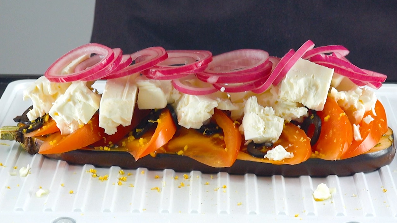 2.3 Schneide nun die Tomate in Schnitze und lege diese obendrauf. Anschließend kommen die in Scheiben geschnittenen Oliven, der Fetakäse und die Zwiebelringe, die du leicht in Essig marinierst, dazu.