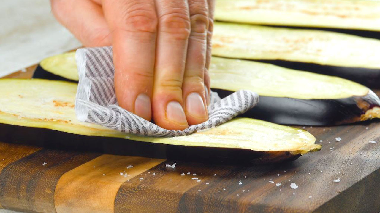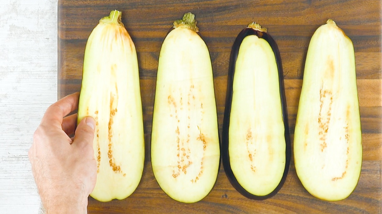 2.1 Schneide zunächst die Aubergine der Länge nach in Scheiben.