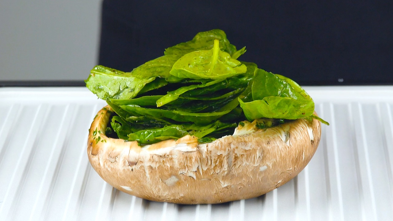 4.2 Lege den Gorgonzola in den Pilz und schichte den Blattspinat obendrauf. Um dem Spinat etwas Pfiff zu geben, würze ihn vorher mit etwas Olivenöl, Pfeffer und Salz.