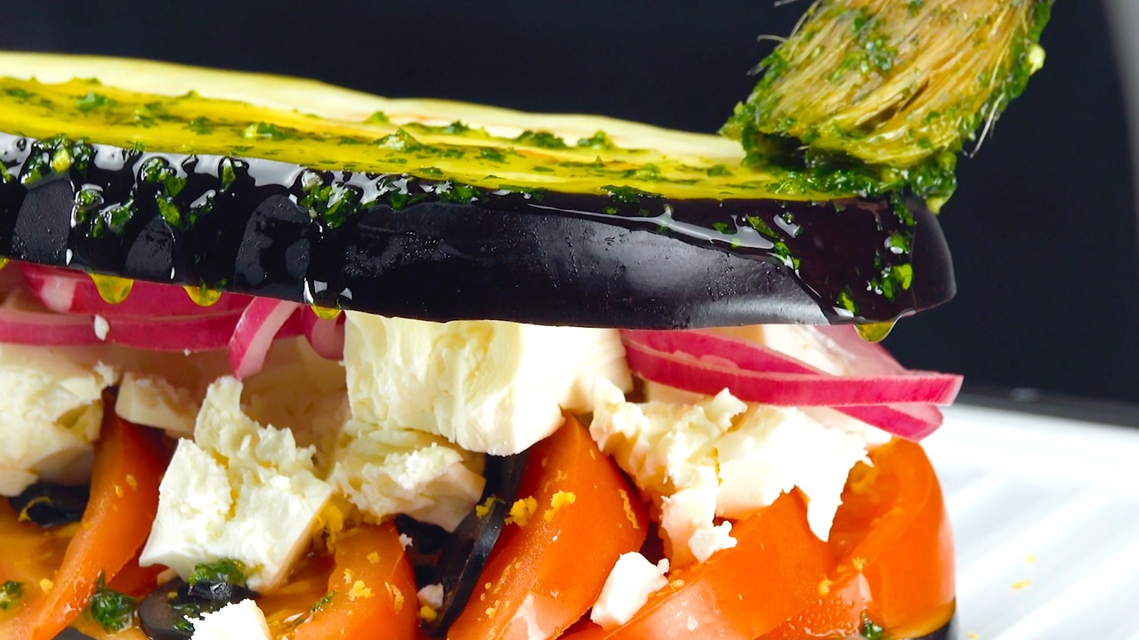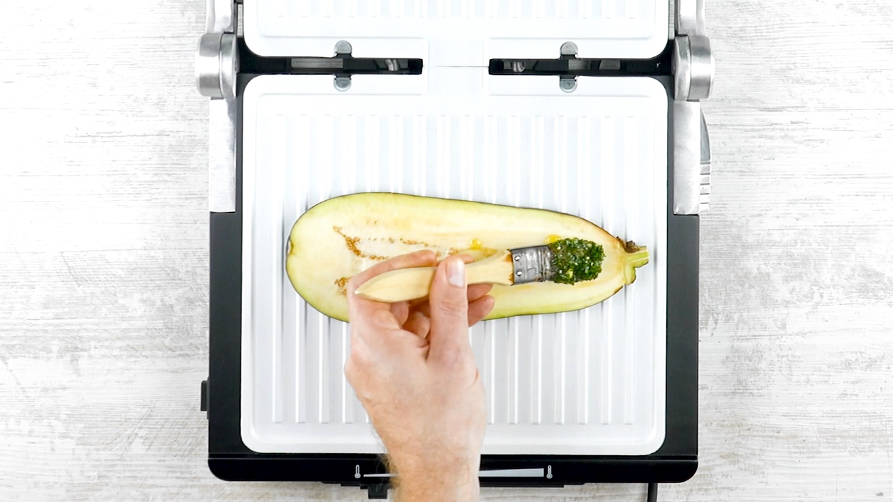2.4 Zum Schluss legst du eine weitere Auberginen-Scheibe obendrauf und bestreichst sie mit dem Petersilien-Pesto.