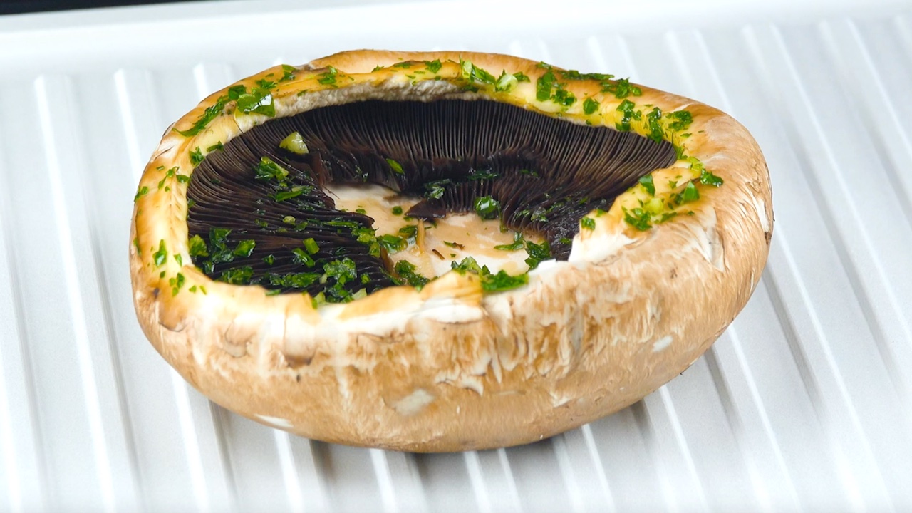 4.1 Entferne zunächst von beiden Pilzen die Stiele und lege den ersten Pilz verkehrt herum auf den Grill. Bestreiche das Innere dann mit Petersilien-Pesto, das du aus der gehackten Petersilie, der Knoblauchzehe und dem Olivenöl herstellst.