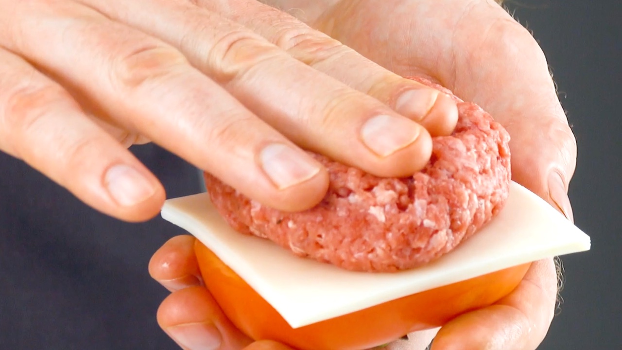 1.1 Schneide die Tomate in zwei Hälften und lege auf die obere Hälfte 1 Scheibe Käse sowie das zu einer Kugel gerollte Hackfleisch.