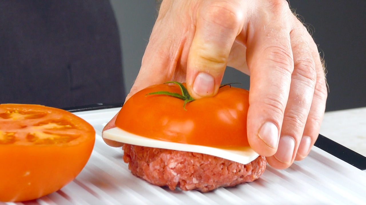 1.2 Drücke das Fleisch leicht zu einem Burgerpatty an und lege die Tomatenhälfte mit der Fleischseite auf den Grill. Die zweite Tomatenhälfte legst du mit der Schnittfläche nach oben daneben.