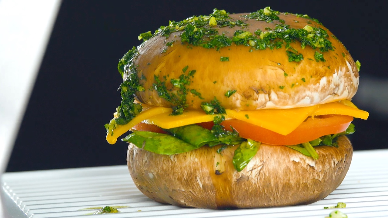 4.4 Danach wird der zweite Pilz als „Deckel“ obendrauf gesetzt und ebenfalls mit dem Petersilien-Pesto eingepinselt.