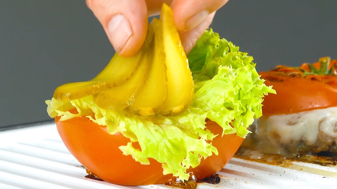 1.4 Lege danach auf die zweite Tomatenhälfte ein Blatt Salat sowie die in Scheiben geschnittene Essiggurke und gib etwas Burgersoße hinzu.
