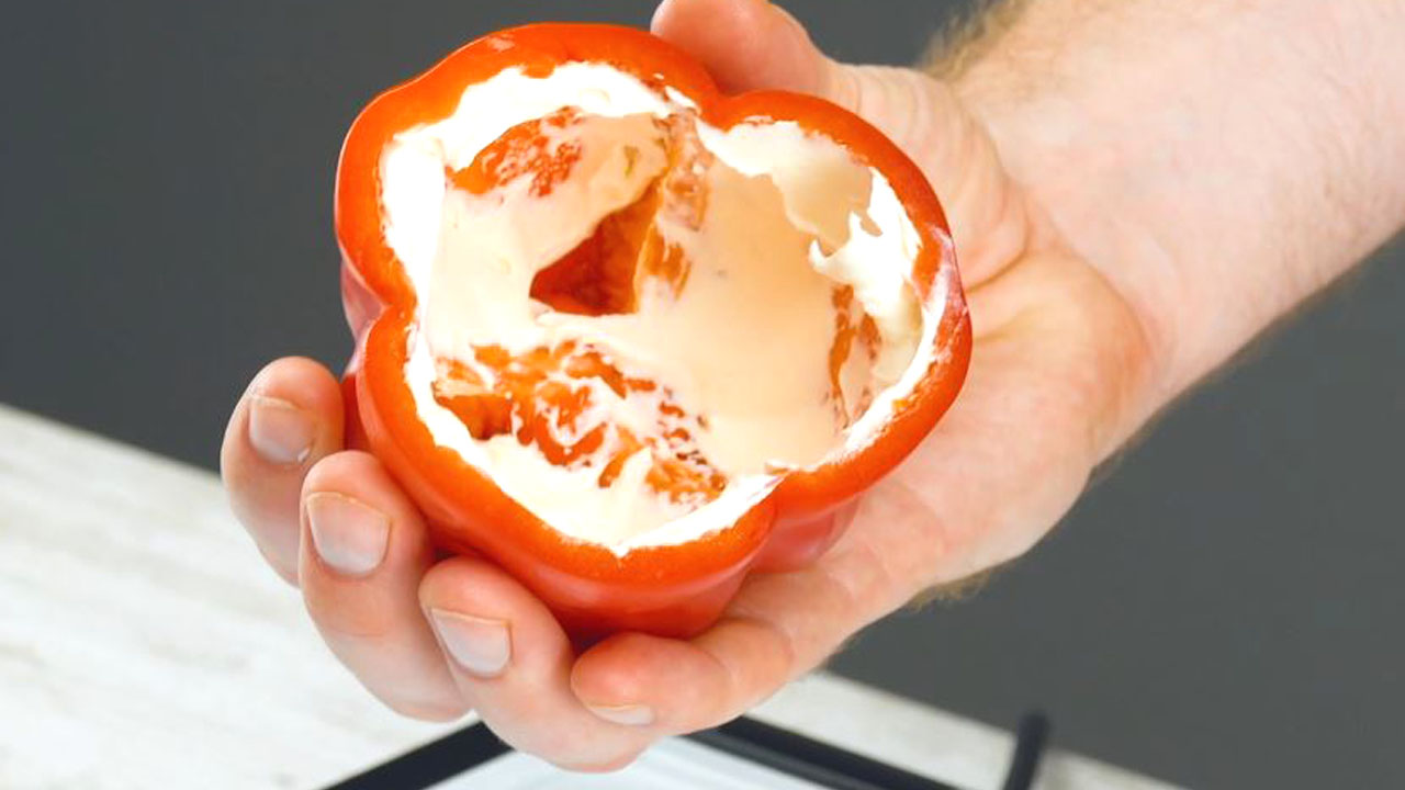 3.1 Schneide zuerst den Stielansatz der Paprikaschote aus, entferne das Kerngehäuse und verteile den Frischkäse an der Innenseite der Frucht.
