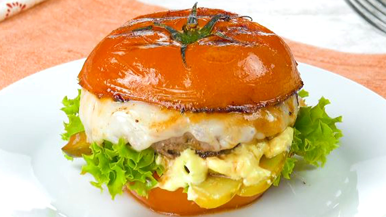 1.5 Zum Schluss setzt du die Tomatenhälfte mit dem Fleisch und dem Käse auf die andere Hälfte und fertig ist dein leckeres Tomaten-Sandwich.