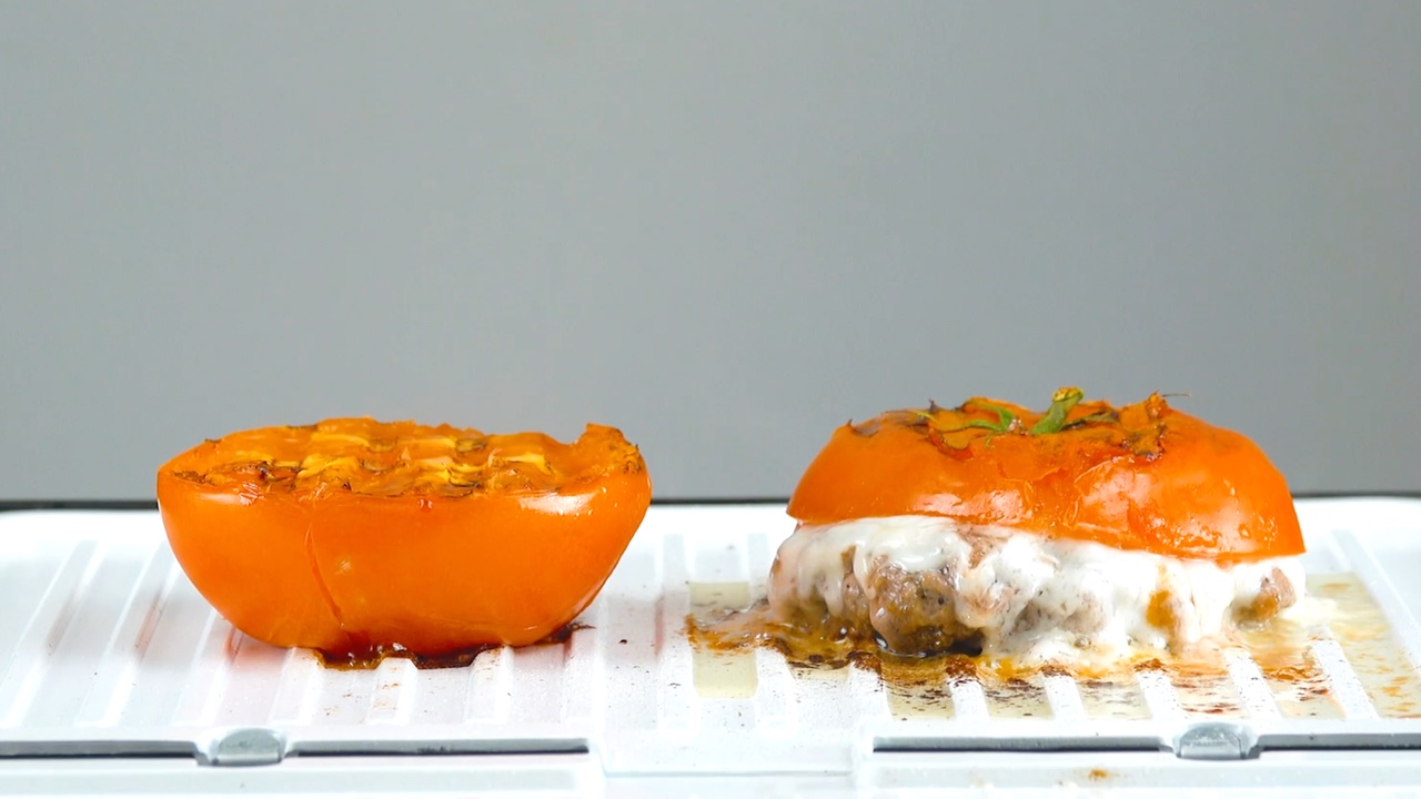 1.3 Grille beide Tomatenhälften im Sandwichmaker dann für etwa 10-15 Minuten, bis der Käse zerlaufen und das Fleisch gut durchgebraten ist.