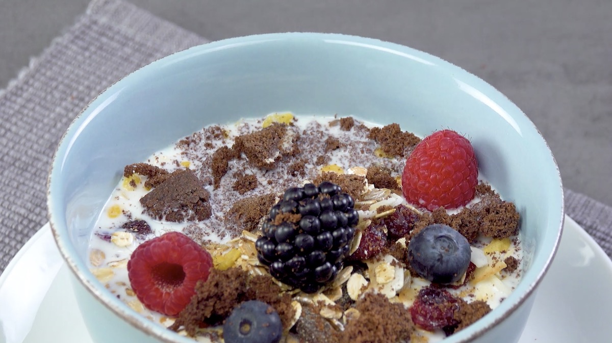 So geht es: Auch dein Müsli kannst du mit trockenem Kuchen pimpen. Gib dafür einfach Müsli und Milch in eine Schale und dekoriere das beliebte Frühstück mit Beeren und einem zerbröselten Kuchenstück.