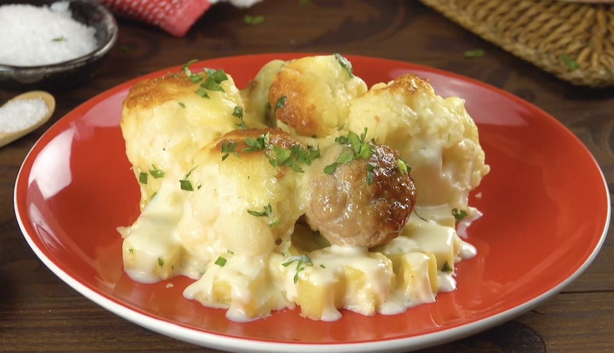 4. Blumenkohlauflauf mit Bratwurstbällchen und Kartoffeln