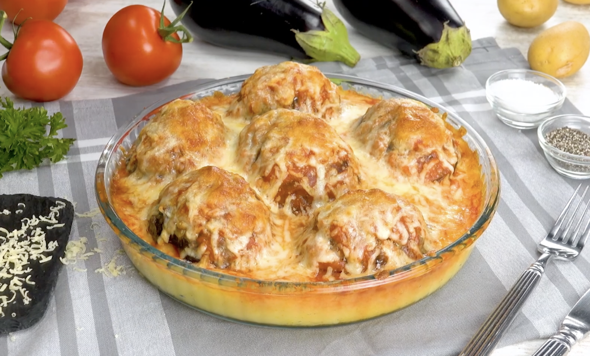 3. Köstlicher Auflauf: mit würzigem Hackfleisch gefüllte Aubergine auf Kartoffeln
