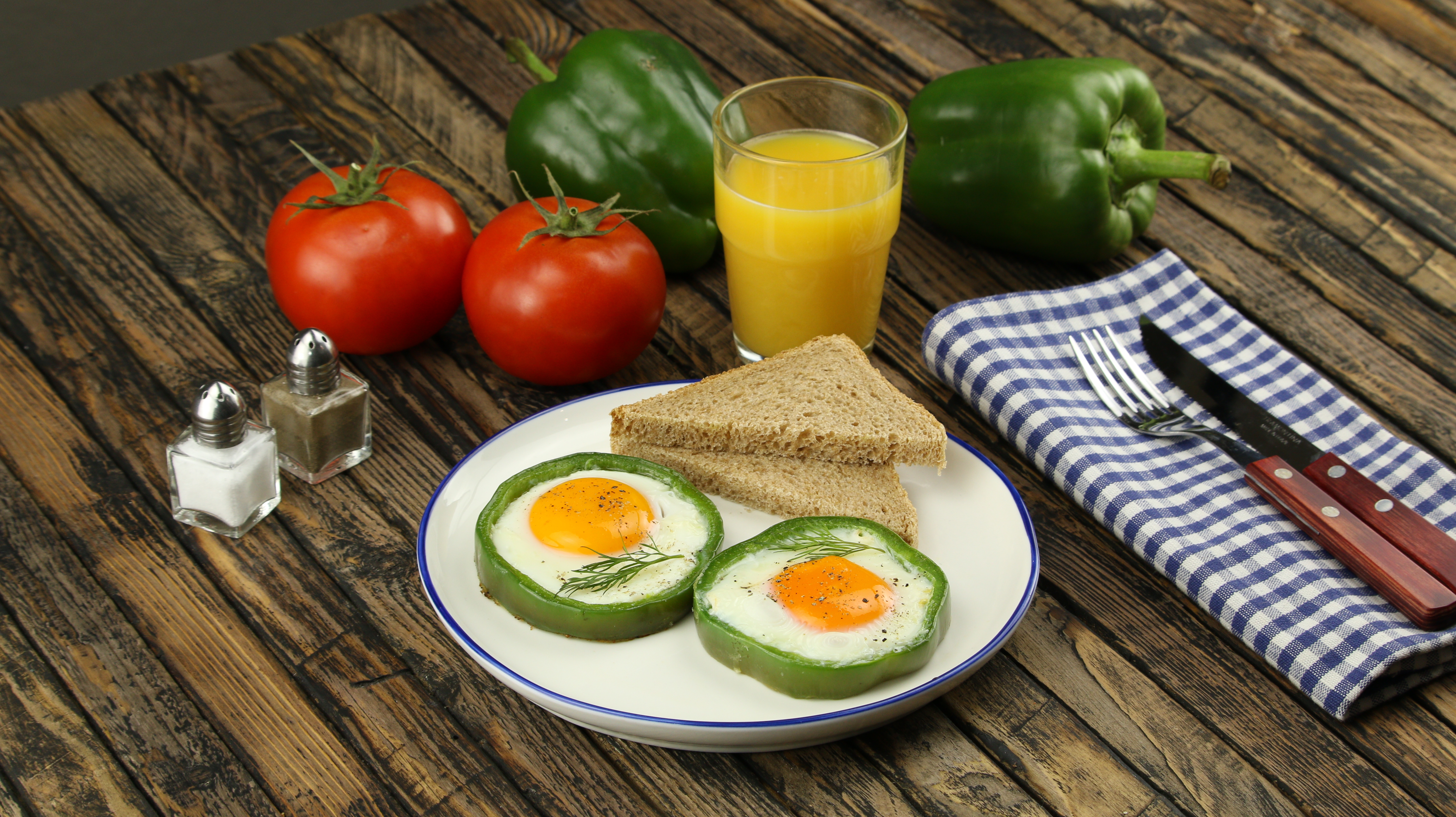 - Zerlasse die Butter in einer Pfanne, brate zwei Paprikaringe von beiden Seiten an und lege dann jeweils eine Scheibe Tomate in die Ringe. Auf diese lässt du das Ei gleiten, das nun noch gesalzen und gepfeffert wird.