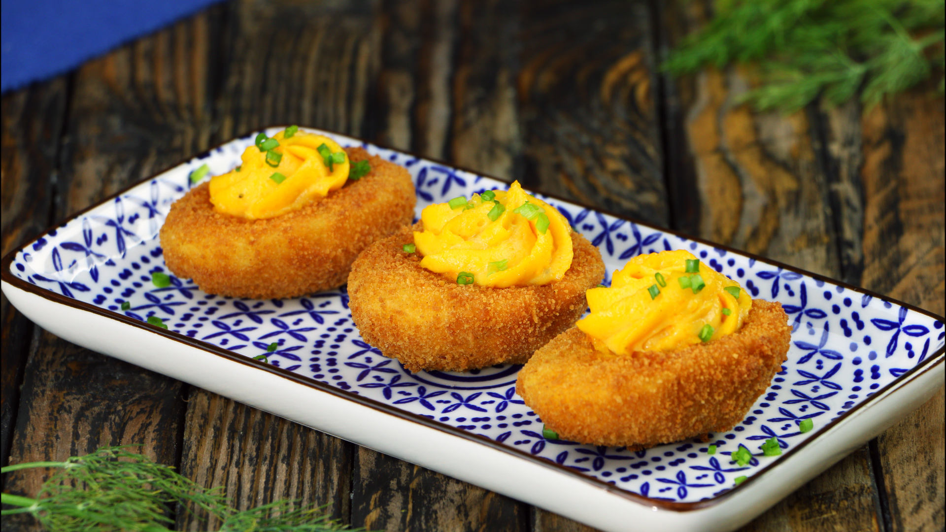 - Jetzt werden die sechs anfangs ihres gelben Inneren beraubten Eihäften in gewohnter Manier paniert: erst im Mehl, dann im verquirlten (vierten) Ei, dann im Paniermehl wälzen. Frittiere die Hälften anschließend.