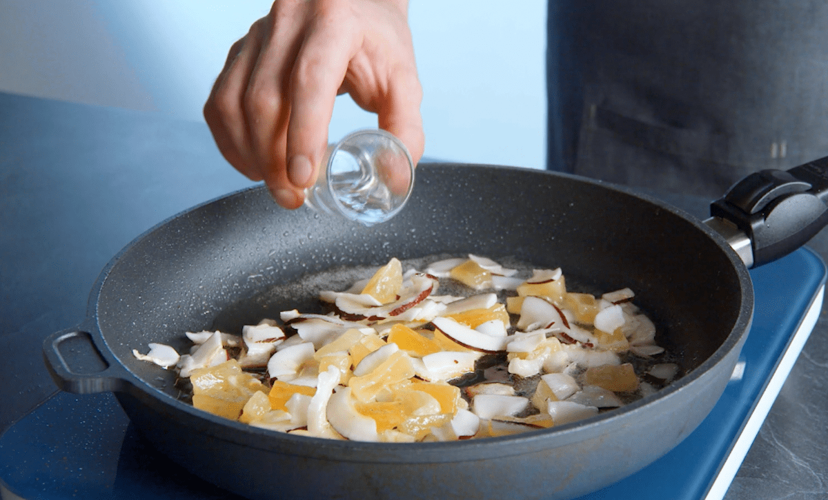 1.1 Röste die getrockneten Ananas und die Kokoschips in Kokosfett an. Lösche alles mit Rum ab und flambiere es daraufhin.