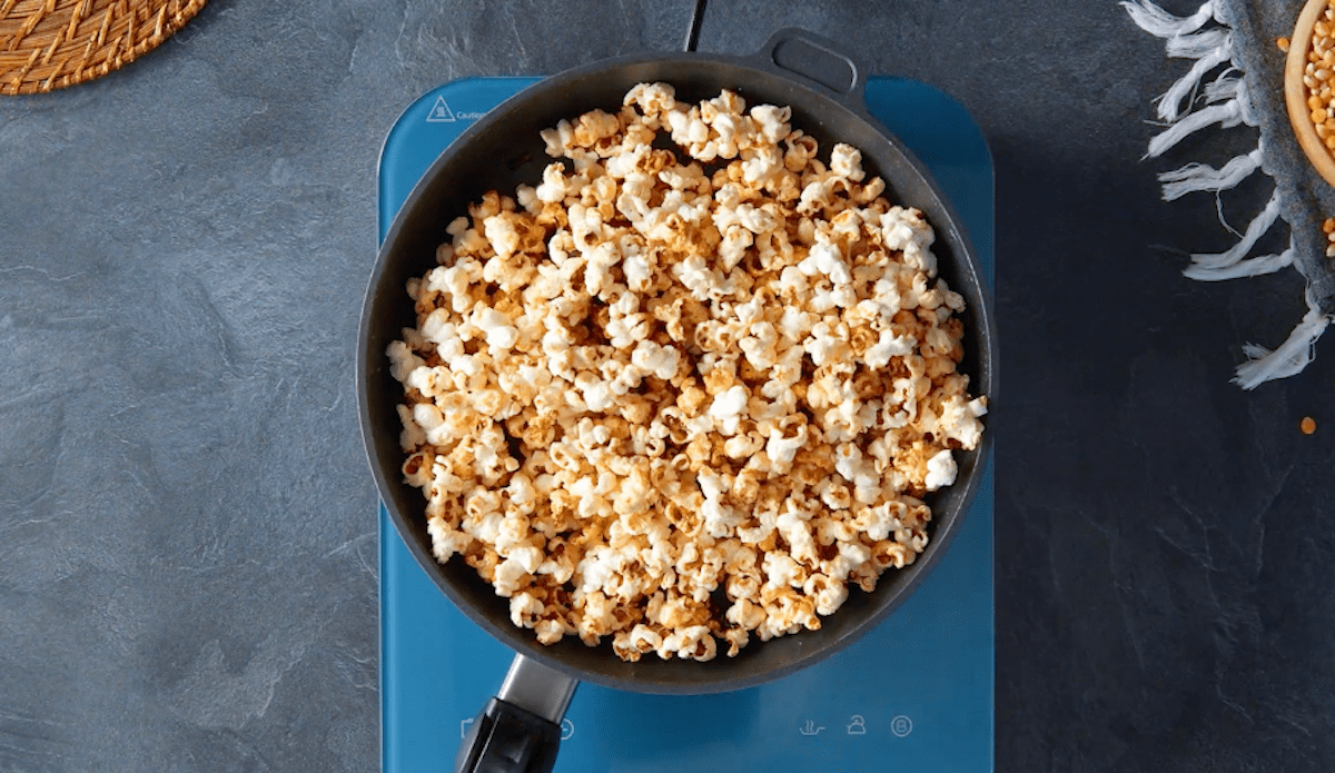 1.2 Nun kommt der Popcornmais in die Pfanne. Setze den Deckel auf die Pfanne und warte, bis die Maiskörner aufgepoppt sind.