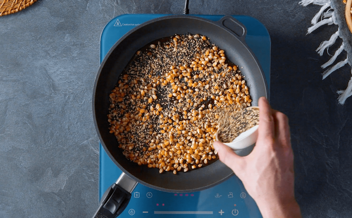 4.1 Gib Sesamöl mit Popcornmais und der Sesam-Mischung in eine Pfanne. Setze einen Deckel auf die Pfanne und warte, bis die Maiskörner aufgepoppt sind. Vermenge alles gut miteinander.