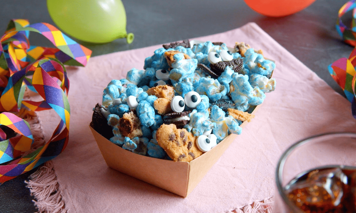 3.2 Vermenge alles gut miteinander und fülle das Popcorn in eine Schüssel. Dekoriere das Krümelmonster-Popcorn noch mit Zuckeraugen.