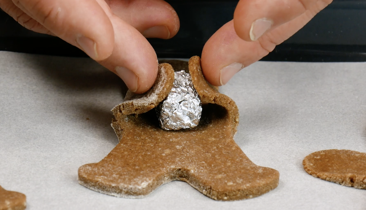 3.1 Hole den Teig aus dem Kühlschrank und rolle ihn ca. 0,5 cm dick aus. Stich dann mit dem Förmchen die Lebkuchenmänner aus. Forme nun die Alufolie in kleine Bälle (pro Ball ca. 20 x 20 cm Folie) und lege diese auf den Körper der Teigmänner. Drücke deren Arme dann leicht platt und klappe die Arme nach innen, sodass es aussieht, als ob sie den Aluball festhielten. Backe die Männer für ca. 10 bis 12 Minuten bei 175 °C Ober- und Unterhitze.