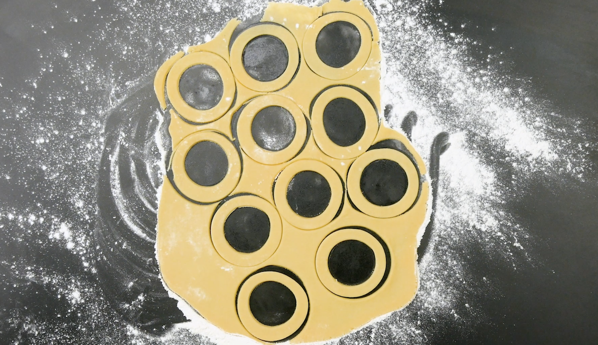 5.1 Halbiere den Teig und rolle die eine Hälfte aus (die andere Hälfte nutzt du für die nächsten Plätzchen). Stich mit einem Glas Kreise aus. Stich dann mit einem kleineren Glas kleinere Kreise aus den Kreisen aus, sodass ein Ring übrig bleibt.