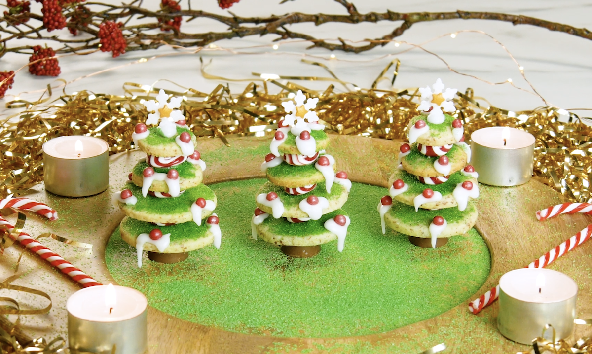 2.3 Nutze den Schokodrops als Wurzelfuß, gib einen Klecks Zuckerguss auf ihn und setze ein großes Plätzchen darauf. Dann folgen: Zuckerguss, Bonbon, Zuckerguss, großes Plätzchen, Zuckerguss, Bonbon, Zuckerguss, kleines Plätzchen, Zuckerguss, Bonbon, Zuckerguss, kleines Plätzchen. Verziere den Baum zum Schluss noch mit Zuckerguss, Zuckerperlen und Zuckersternen.
