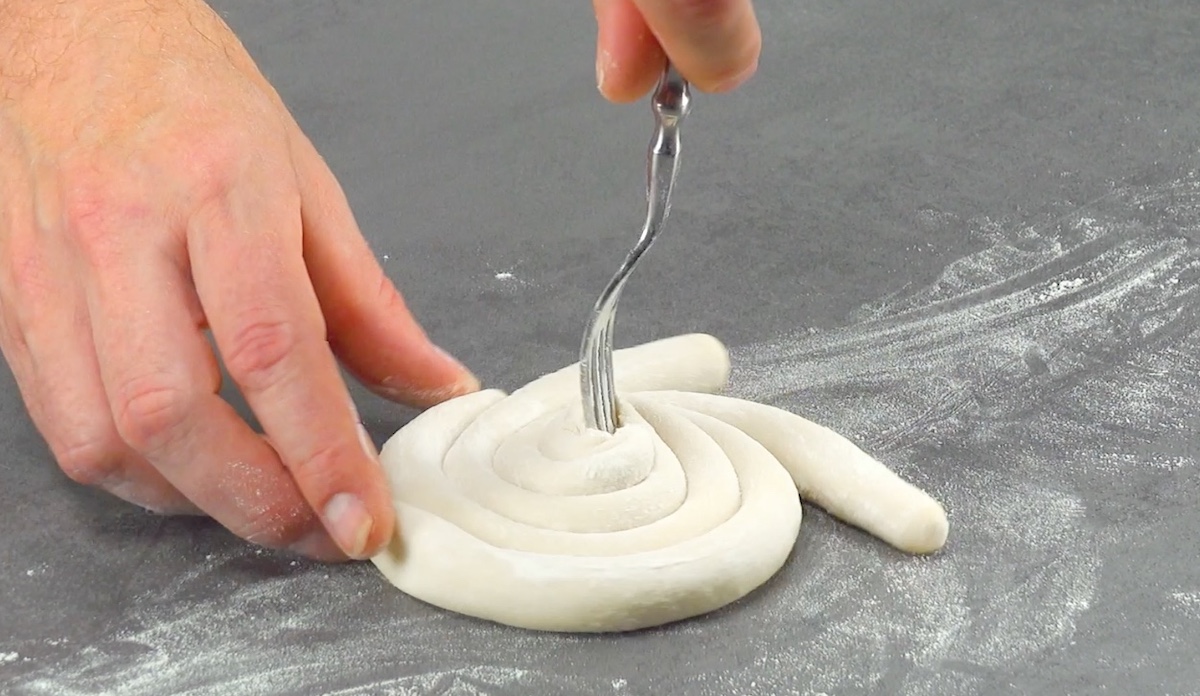 6.2 Lege die Teigrollen nebeneinander. Stich nun mit einer Gabel gleichzeitig in beide Teigrollen. Drehe die Teigrollen dann mithilfe der Gabel vorsichtig zu einer Spirale auf.