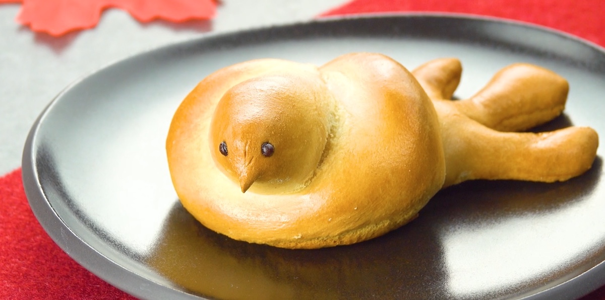 3.1 Forme den Teig zu einer länglichen Rolle. Verknote die Rolle in der Mitte und forme an einer Seite einen Schnabel.