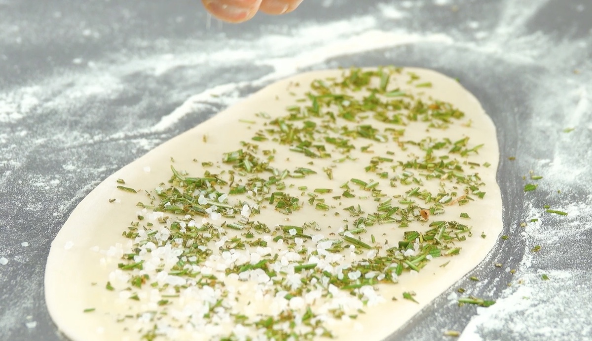 7.1 Rolle den Teig länglich aus. Bestreiche ihn mit Olivenöl und verteile darauf den Rosmarin sowie etwas Salz.