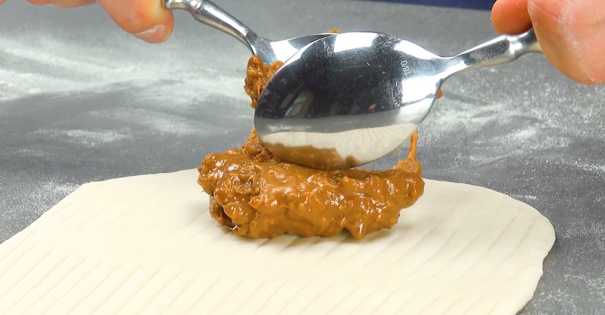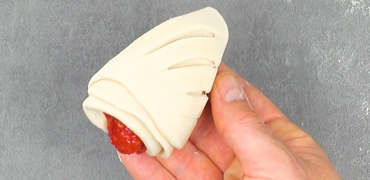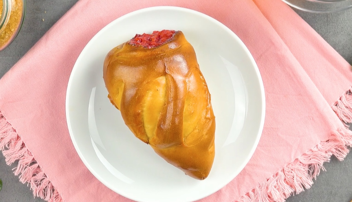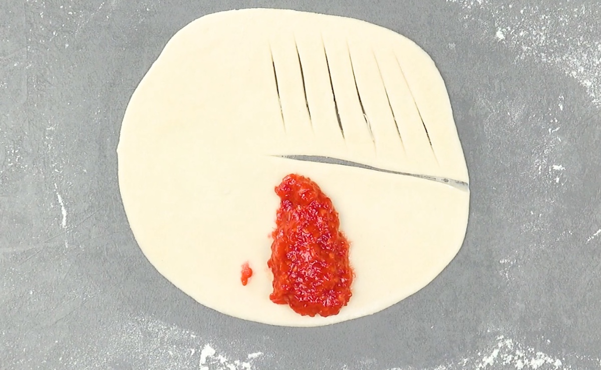 2.1 Rolle den Brioche-Teig aus. Schneide ihn dann, wie im Video gezeigt, ein und platziere auf der unteren Seite die Himbeermarmelade.